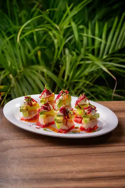 Callo de hacha, atún fresco, queso crema y aguacate con mermelada agridulce.