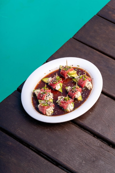 Rollito de atún fresco, carne de jaiba con mayonesa y aguacate en salsa cítrica.