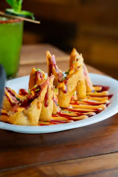 Acompañados de aderezo de chipotle y reducción de vino tinto.