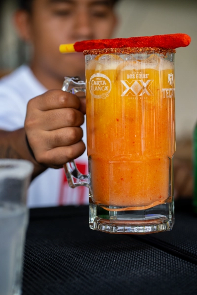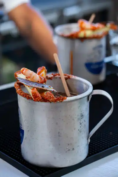 Cerveza, clamato, salsa negra, carne seca, camarón y pepino.