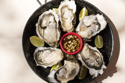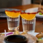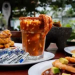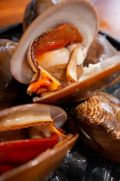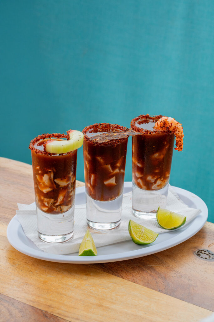 Trío de shots de camarón, callo de hacha y ostión con clamato, limón y salsa negra.