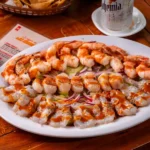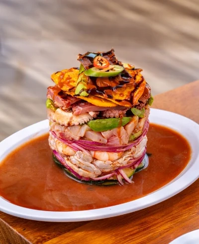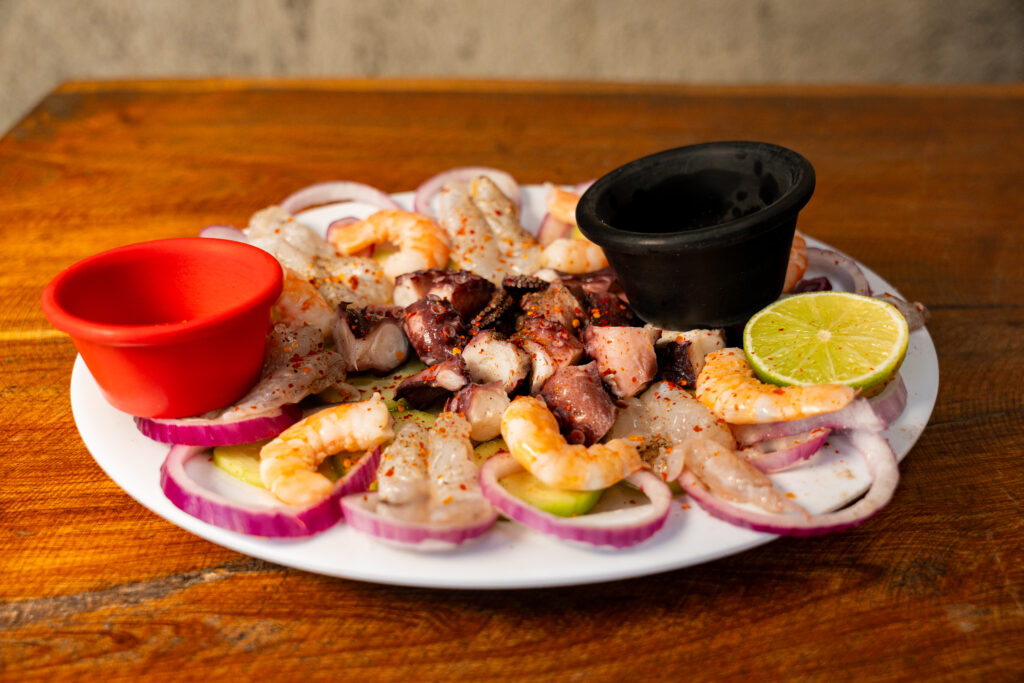 Camarón crudo curtido en limón y sal, camarón cocido, trozos de pulpo al chiltepín.