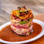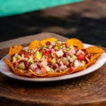 Atún, camarón crudo y cocido, callo de hacha, manitas de jaiba y ostiones. Cebolla y Tostitos.