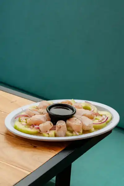 200 g de callo de hacha con pepino, cebolla morada, pimienta, limón y sal de grano.